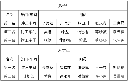 通過每次的消防演練及消防知識的培訓(xùn),不僅進(jìn)一步增強(qiáng)了廣大員工的防范意識和自救能力,了解和掌握如何識別危險(xiǎn)、如何采取必要的應(yīng)急措施等基本操作,以便在事故中達(dá)到快速、有序、及時(shí)、有效的效果。同時(shí)為了鼓勵廣大員工能更踴躍的融入到消防演練的集體中,在此次演練評選出男子組前三名、女子組前兩名,并頒發(fā)了獎狀及獎金,以資鼓勵。獲獎名單如下: