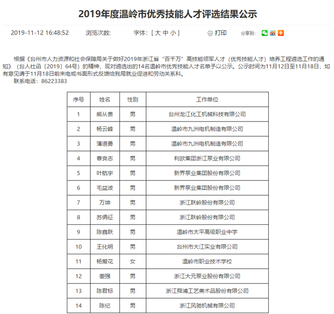 為高水平建設(shè)人才強(qiáng)省,進(jìn)一步加快高技能人才隊(duì)伍建設(shè),我司根據(jù)《臺(tái)州市人力資源和社會(huì)保障局關(guān)于做好2019年浙江省“百千萬(wàn)”高技能領(lǐng)軍人才培養(yǎng)工程遴選工作的通知》要求,通過(guò)我司推薦,經(jīng)資格初審、評(píng)委會(huì)評(píng)審等環(huán)節(jié),我司研發(fā)中心陳紀(jì)被評(píng)選為溫嶺市優(yōu)秀技能人才,并在網(wǎng)上予以公示,符合公司的價(jià)值觀 “客戶為先、誠(chéng)信負(fù)責(zé)、團(tuán)隊(duì)合作、務(wù)實(shí)創(chuàng)新”精神。
