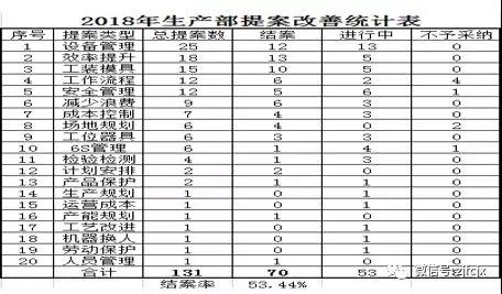 2018年,生產(chǎn)部各車間合計(jì)提案改善131件,完結(jié)70件,推進(jìn)中53件,不予采納8件。大家的提案,涉及到生產(chǎn)管理的方方面面,非常廣泛。