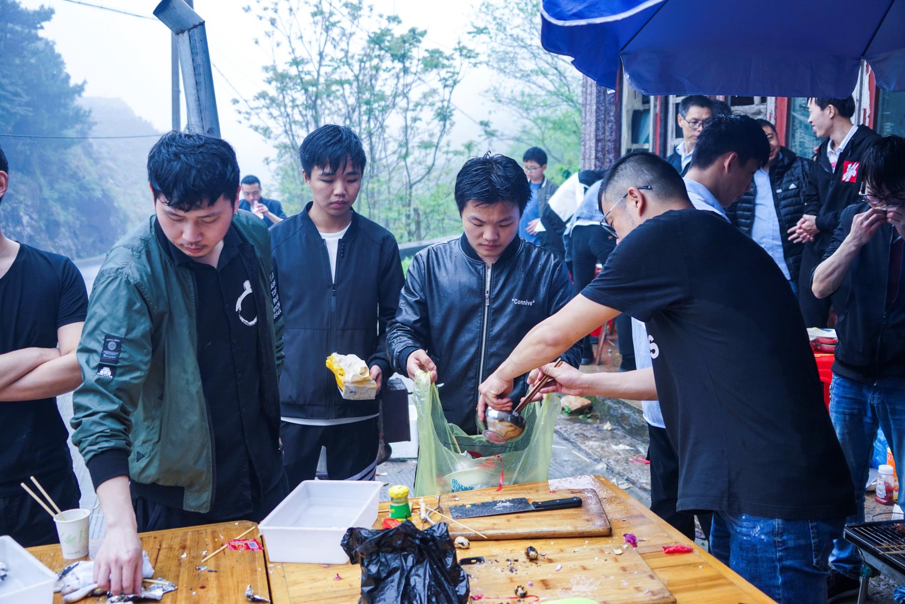 在各組成員吃飽喝足充滿能量之后 ,開始了此次活動最高潮部分——暴走。在開始暴走之前,參加暴走的全體成員在自行車協(xié)會牌前集合進行了合影留念,之后開始了暴走活動。天氣依然是跟早上一樣,三米開外的地方,似乎什么都看不清了,天空中也下著蒙蒙細(xì)雨,但一點也不影響我們的心情。大家一邊歡快地聊著天,一邊向上地攀登者。享受著霧蒙蒙的風(fēng)景,在這詩情畫意中繼續(xù)著。很快我們從平坦的水泥路轉(zhuǎn)到了泥濘的山路中。疊翠的峰巒、茂密的森林和曲折盤旋的山路讓我們不禁陶醉其中,盡情領(lǐng)略大自然的風(fēng)情。各個部門之間都彼此相互鼓勵、相互協(xié)助,不斷挑戰(zhàn)著自己。