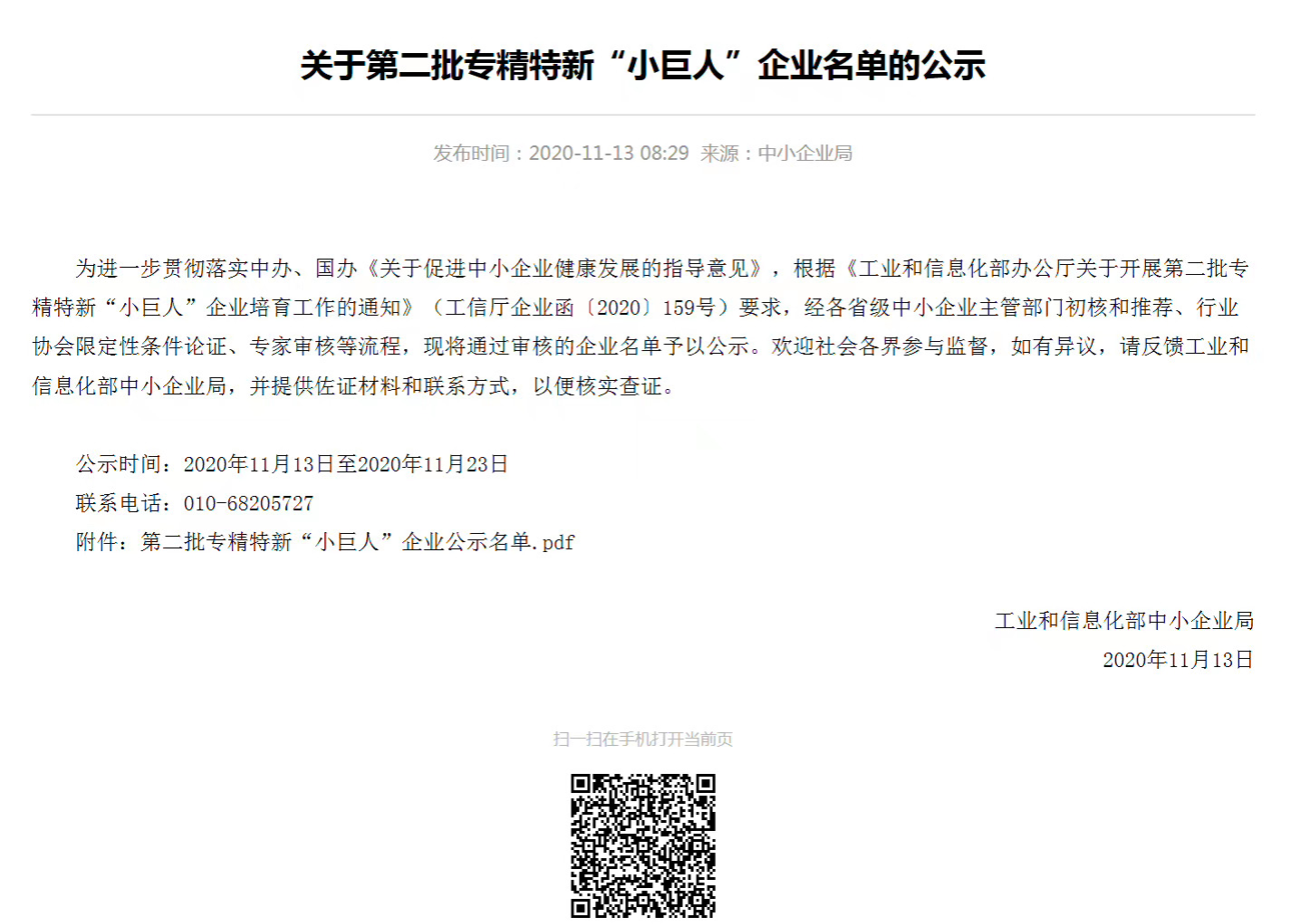 根據(jù)《關(guān)于組織推薦第二批國(guó)家級(jí)專精特新“小巨人”企業(yè)》文件通知要求,我司通過(guò)地方經(jīng)信推薦,符合申報(bào)要求,積極準(zhǔn)備相關(guān)資料上報(bào),經(jīng)各地經(jīng)信部門初審、市級(jí)相關(guān)部門會(huì)審以及省級(jí)專家評(píng)審,我司順利通過(guò)評(píng)審,成功入選“國(guó)家級(jí)專精特新“小巨人”名單,取得國(guó)家級(jí)榮譽(yù),并在工信部平臺(tái)上予以公布。