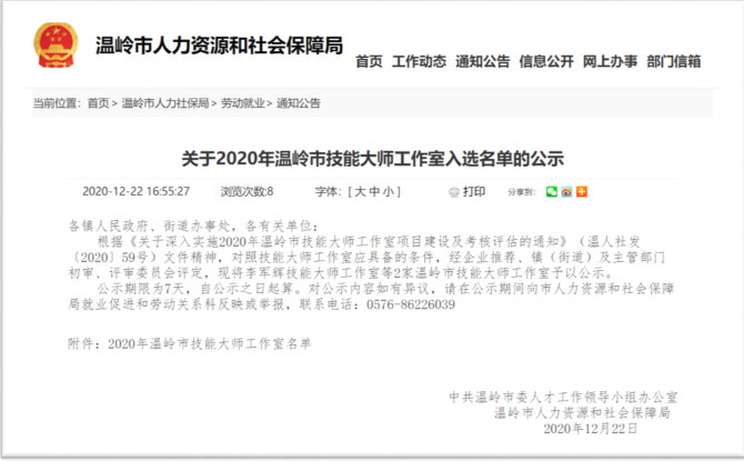我司根據(jù)《關(guān)于深入實(shí)施2020年度溫嶺市技能大師工作室項(xiàng)目建設(shè)及考核評(píng)估的通知》(溫人社發(fā)〔2020〕59號(hào))文件精神,通過(guò)自行推薦以及地方政府的大力支持,充分準(zhǔn)備了相關(guān)申報(bào)資料,通過(guò)主管部門的初審以及專家的評(píng)審、部門審議和社會(huì)公示等評(píng)選環(huán)節(jié),我司最終順利通過(guò)評(píng)審,被評(píng)定為“李軍輝技能大師工作室”并于政府平臺(tái)公示。